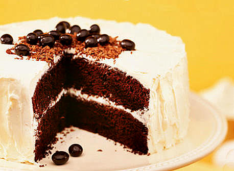 Place one layer on cake plate and using palette knife spread half of the icing to edge. Top with second cake layer and remaining icing and make decorative swirls with icing. Sprinkle edge and centre with grated chocolate and garnish with chocolate covered coffee beans.